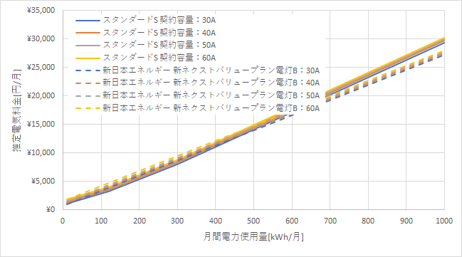 東京電力「スタンダードS」と新日本エネルギー「新ネクストバリュープラン電灯B」の料金比較をした結果、契約容量(アンペア)、毎月の電力使用量にかかわらず新日本エネルギーへ乗り換えることで電気料金が安くなります。
